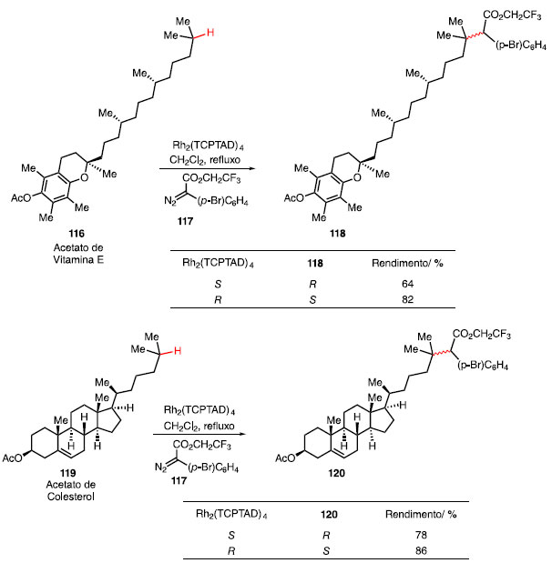 Esta metodologia mostrou-se compatível com acetato de vitamina E (116) e acetato de colesterol (119), utilizando o diazo composto 117 (Esquema 24). A alquilação ocorreu exclusivamente na ligação C-H terciária representada, mesmo na presença de outros sítios terciários e secundários nesses compostos, fornecendo os produtos 118 e 119 com razões regioisoméricas superiores a 98:2.43 A mudança do catalisador Rh2(S-TCPTAD)4 para o enantiômero correspondente levou à um aumento do rendimento para ambos os casos.