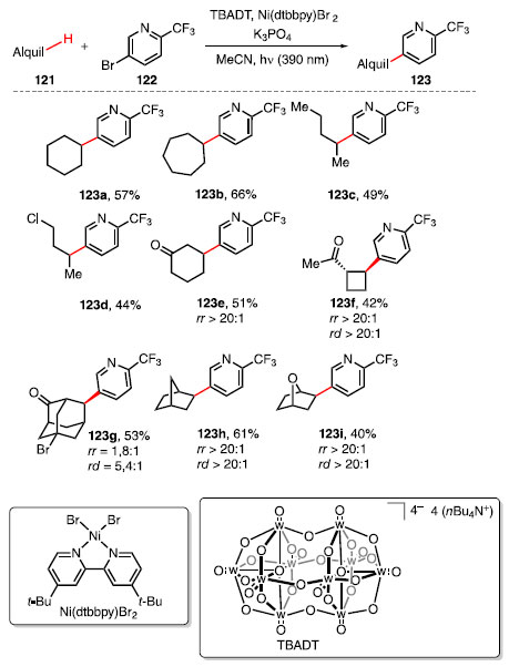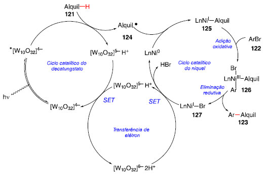 Nesse estudo, utilizou-se da catálise metalo fotoredox por Ni(dtbbpy)Br2, decatungstato de tetrabutilamônio (TBADT), K3PO4 em MeCN promovida por radiação próxima a região do UV, obtendo produtos 123 com uma ligação C-C entre um grupo alquil e um grupo aril.45 No escopo investigado, nota-se que cicloalcanos, variando de seis a sete carbonos, fornecem produtos com rendimentos moderados, como observado em 123a e 123b. Sistemas lineares alifáticos apresentam estatisticamente maior preferência de arilação na posição 2 menos impedida estericamente, entre todos os regioisômeros formados, mesmo quando apresentam grupos retiradores de densidade eletrônica, fornecendo os produtos 123c e 123d com rendimentos moderados. A presença de um grupo funcional retirador de elétrons como cetonas é tolerável, sendo que a arilação ocorre em posições distantes a ela, como nota-se em 123e-123g. Alcanos bicíciclos e aqueles contendo heteroátomo, especialmente derivados do adamantano são funcionalizados nas posições metilênicas, fornecendo produtos como 123h-123j, com rendimentos moderados.45 O ciclo catalítico proposto para a reação começa com o ciclo de decatungstato, aonde ocorre a fotoexcitação de [W10O32]4-para *[W10O32]4-, seguido de processo HAT com o substrato 121, permitindo a formação do radical 124 e do catalisador reduzido [W10O32]5-H+. O desproporcinamento do catalisador reduzido via SET regenera o ciclo catalítico do decatungstato e forma a espécie [W10O32]6- 2H+. O catalisador LnNi0 captura o radical 124, obtendo o intermediário de NiI 125, que ao sofrer a adição oxidativa do haleto de arila 122, produz a espécie de Nim 126. Após a etapa da eliminação redutiva, o produto 123 é proporcionado, e a espécie do catalisador de NiI é regenerada via SET, liberando HBr, [W10O32]5- H+ e o catalisador de Ni0, fechando os três ciclos catalíticos (Esquema 26).45