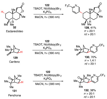 A funcionalização de ligações C-H no esclareolídeo (32), canfeno (102) e fenchona (104), produtos naturais da classe dos terpenos que apresentam propriedades antifúngicas, utilizando a condição padrão mostrou-se eficaz (Esquema 27).46 Eles se mostraram parceiros de acoplamento competentes, fornecendo os produtos arilados 101, 103 e 105 em 41%, 70% e 38% de rendimento, respectivamente, com razões regioisoméricas e diasteroisoméricas acima de 1,4:1 e 20:1.