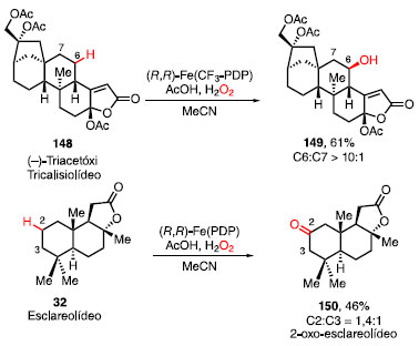 Enquanto o catalisador Fe(PDP) é utilizado preferencialmente na conversão de ligação C-H de metinos 139 aos correspondentes 140, o catalisador Fe(CF3-PDP) é utilizado na conversão de ligação C-H de metilenos 141 a cetonas 142. O composto 143 mostra que a hidroxilação ocorre preferencialmente no carbono terciário mais rico em elétrons, ou seja, mais longe do grupo retirador de elétrons com 56% de rendimento, e com a relação de produto de oxidação distante:próximo maior que 99:1.48 Já a partir da formação do álcool 144 é possível observar que, em ligações C-H com o mesmo ambiente eletrônico, o catalisador vai atuar preferencialmente em um local estericamente mais acessível, pois a outra ligação C-H terciária está orientada mais próxima ao acetato, tornando-se menos acessível estericamente. Efeitos estereoeletrônicos como, por exemplo, a hiperconjugação também influenciam na seletividade e o composto 145, proveniente de uma oxidação da posição carbinólica, é formado em 41% de rendimento. Ácidos carboxílicos apresentam um efeito benéfico na atividade catalítica desses sistemas e são amplamente utilizados como aditivos.49 Na ausência desses aditivos, moléculas contendo ácidos carboxílicos podem dirigir a reação como, por exemplo, na síntese da lactona 146 em 63% de rendimento. Há substratos onde fatores estéreos e eletrônicos divergem fortemente para favorecer locais distintos e, nesses casos, Fe(PDP) acaba sendo pouco seletivo. Nesses substratos, Fe(CF3-PDP) forneceu sitiosseletividade útil com base em sua capacidade de superar influências eletrônicas no substrato em favor de fatores estéreos como pode ser observado para o aminoácido 147. Essa abordagem com catalisadores também funcionou com moléculas complexas (Esquema 30). O (-)-Triacetóxi Tricalisiolídeo (148) é um metabólito putativo derivado do cafestol, que é um diterpeno extraído do café. A oxidação de 148 utilizando o (R,R)-Fe(CF3-PDP) forneceu o álcool 149 seletivamente no C6 do diterpeno com 61% de rendimento. O esclareolídeo (32) possibilitou a reação com (R,R)-Fe(PDP), obtendo o 2-oxo-esclareolídeo 150 com 46% de rendimento.10,48,50