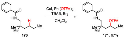 Além de catalisadores não-heme de ferro e manganês, Yang e colaboradores, em 2018, reportaram a oxidação C-H de amidas catalisada por cobre (Esquema 35).55 Eles utilizaram o grupo diretor benzoato para direcionar a funcionalização da molécula 170, e formar a ligação C-O do produto 171. Para isso, foi o CuI como catalisador, PhI(OTFA)2 como oxidante, e reagente de transferência do grupo -OTFA, TBAB e Br2 como aditivos, em CH2Cl2.
