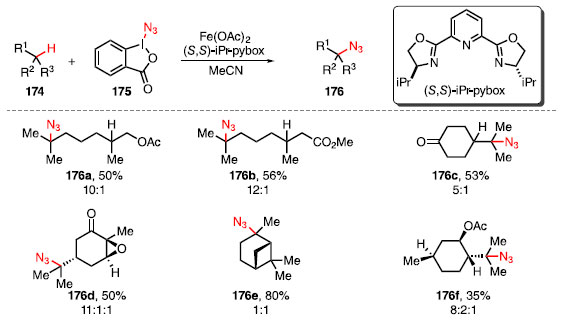 A reação de azidação foi seletiva para ligação C-H terciária mais rica em elétrons, resultando em rendimento moderado para o isômero isolado, como em 176a e 176b. Para ambos os exemplos a seletividade favoreceu a ligação C-H mais distante do retirador de elétrons. Tal reatividade também foi observada em compostos cíclicos 176c e a oxidação ocorreu na ligação C-H terciária mais rica eletronicamente, e com uma seletividade maior para a ligação C-H mais distante da cetona, fornecendo o produto em 53% de rendimento. Esse método também se mostrou tolerante à presença de epóxidos e anéis de quatro membros 176d e 176e, também com rendimentos de moderados a bons. Para o produto 176d, a reação foi bastante seletiva, funcionalizando a ligação C-H do grupo isopropila. Para o produto 176e, mesmo com o alto rendimento, não foi seletiva a ponto de o produto não apresentar excesso diastereoisomérico. Em casos em que as ligações C-H eram eletronicamente similares, como 176f, apesar de ser menos acessível estericamente, a flexibilidade conformacional do grupo isopropila promove a azidação seletiva da ligação C-H da mesma.58 O mecanismo da reação, proposto pelo grupo de pesquisas de Hartwig em uma publicação recente,59 mostra que ocorre primeiramente a quebra homolítica da ligação I-N do composto 175, formando os radicais 177 e »N3, e ambos são responsáveis pela abstração do átomo de hidrogênio (do inglês hydrogem atom abstraction, HAA), formando o ácido carboxílico 178, HN3 e o intermediário radicalar 179. No ciclo catalítico do ferro, o [Fen] reage com o 175, podendo formar diretamente o complexo [Fe111]-N3 ou o complexo 180, nesse caso ocorrendo a troca de ligante com HN3, convergindo ao mesmo complexo [FeIn]-N3. Este complexo é o responsável por reagir com o radical 179, fornecendo o produto 176 e o complexo [Fe11], completando o ciclo catalítico (Esquema 38).