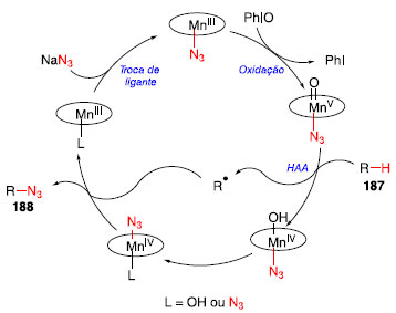 Os catalisadores de manganês utilizados foram o Mn(TMP)Cl, com o ligante porfirínico, e o Mn(salen)Cl, com ligante sendo uma base de Schiff. O escopo reacional mostra que é possível realizar a reação de azidação de ligações C-H de metilenos, como o caso de 188a, no entanto, como mostrado pelos produtos 188b-188d, a funcionalização de ligação C-H terciária, por ser mais rica em elétrons, é favorecida. Esta metodologia também se mostrou tolerável a outros grupos funcionais como, por exemplo, álcool e éster, para os produtos 188c e 188d. O mecanismo de reação proposto para a reação consiste primeiramente na troca de ligantes, partindo de [Mn111]-L para [Mn111]-N3, seguido da oxidação com PhIO para [MnV](O)-N3, sendo este complexo mais reativo, e realizando o processo de HAA sobre o substrato 187, formando o radical R» e o complexo HO- [MnIV]-N3. Esse complexo reage com o radical formado, fornecendo o produto da azidação 188, e liberando o [Mn111]-L, restaurando o ciclo catalítico (Esquema 40).60
