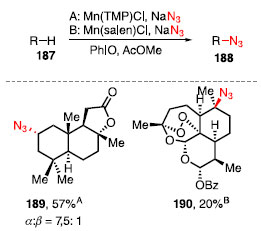 Essa metodologia pôde ser aplicada na modificação de produtos naturais e a reação de azidação catalisada por manganês levou à formação do composto 189, um produto de funcionalização na posição C2 do esclareolídeo (32), com 57% de rendimento e uma razão a:fi de 7,5:1. Esse método também foi eficiente para moléculas frágeis como a artemisinina (12), com a azidação exclusiva na posição C10 como produto 190 em 20% de rendimento (Esquema 41).61