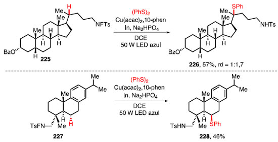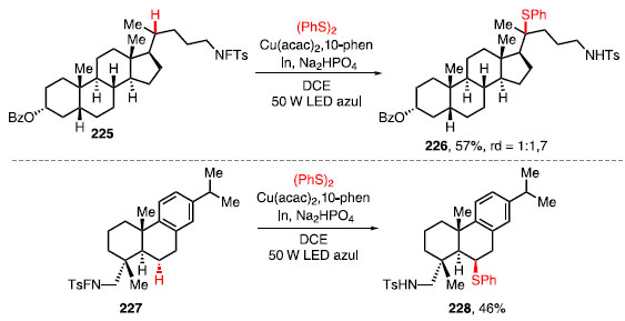 Os dissulfetos substituídos com grupos doadores de elétrons, tais como p-metil e p-metoxi levaram à formação dos produtos 224a e 224b em bons rendimentos, já a presença de grupos retiradores de elétrons como, por exemplo, o grupo nitro, levou a uma diminuição no rendimento para o 224c. Para o produto 224d, o rendimento da tiolação para ligação C-H primária foi de 50%. Cicloalcanos com vários tamanhos de anel tiveram um bom rendimento com a tiolação, como no caso do produto 224e. O grupo adamantino pôde ser funcionalizado e o produto 224f foi obtido em 72% de rendimento. Por fim, essa transformação foi aplicada com sucesso para formar um centro quaternário com um grupo tiol no composto 224g.66 Compostos biologicamente ativos também foram utilizados nessa metodologia (Esquema 49).66 Enquanto a funcionalização de um derivado de 5b-androstano (225) forneceu o composto 226 em 57% de rendimento, a tiolação do derivado de ácido desidroabiético (227), um ácido de resina diterpênica do tipo abietano que possui propriedades antibacterianas, cardiovasculares e antioxidantes, levou à formação do composto 228 em 46% de rendimento como um único diastereoisômero.
