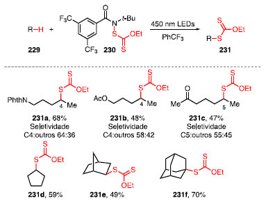 Em 2016, Alexanian e colaboradores descreveram uma abordagem para a formação de ligação C-S a partir da reação de xantilação intermolecular entre um alcano 229, N-xantilamida 230 em PhCF3, sob irradiação de luz azul LED, para fornecer xantatos de alquila 231 (Esquema 50).64