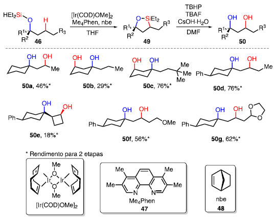 ![]() Esquema 52. 1,3-dióis obtidos a partir da sililação C-H e oxidação de Tamao-Fleming