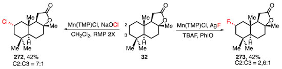 A metodologia forneceu os produtos clorados e bromados 270a e 270b em rendimentos moderados, via procedimento A, assim como a cloração de neo-pentano, fornecendo 270c em 31%, via procedimento B. Ao utilizar o catalisador Mn(TPFPP)Cl, deficiente em elétrons, substratos contendo grupos retiradores de elétrons puderam ser funcionalizados, como o éster 270d, em 82% de rendimento via procedimento C. Utilizando o procedimento D, os compostos 271a e 271b foram obtidos em rendimentos moderados, com a relação diastereoisomérica de 1,5:1 para o produto 271b, com o produto contendo a relação dos substituintes 1,3-anti favorecida. Ao utilizar o procedimento E, biciclos contendo lactonas e lactamas puderam ser funcionalizadas, fornecendo 271c e 271d em 52% e 35% de rendimento, respectivamente, como isômeros exclusivos. Essa metodologia foi aplicada na funcionalização do esclareolídeo (32) (Esquema 62). Nesse estudo, foram realizadas tanto a cloração quanto a fluoração, fornecendo os compostos 272 e 273 em 42% de rendimento para ambos os casos, com a funcionalização preferencial na posição C2. Para a cloração C-H, o material de partida recuperado foi reagido em mais dois ciclos, fornecendo o produto 272.