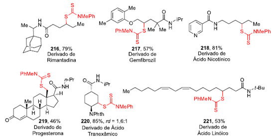 A formação inicial do ditiocarbamato acontece através do acoplamento do ácido carboxílico com uma amina (via formação do cloreto de ácido) obtendo a amida 214 que, então sofre irradiação de luz azul LED em PhCF3 para a funcionalização da ligação C-H, fornecendo o produto ditiocarbamilado 215.65 A ditiocarbamilação não se limitou à inserção em ligações C-H metilênicas como em 215a e 215b, e a funcionalização em ligações C-H metílicas também foi bem sucedida como demonstrado pela obtenção de 215c e 215d. Por fim, substratos cíclicos também se mostraram compatíveis com essa transformação e o composto 215e foi obtido em 81% de rendimento.64 Produtos naturais e fármacos também foram funcionalizados a partir dessa abordagem (Figura 2). A rimantadina, um agente antiviral que inibe especificamente a replicação do vírus influenza tipo A,67 forneceu o produto 216 com 79% de rendimento. O gemfibrozil, utilizado no tratamento de hiperlipidemias, que são alterações metabólicas que ocorrem quando níveis de lipídeos estão altos na corrente sanguínea,68 possibilitou a realização do produto 217 com 57% de rendimento.