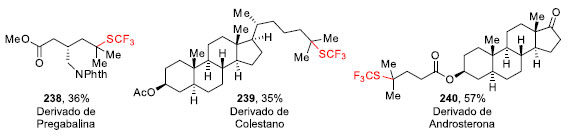 A pregabalina é um fármaco anticonvulsivante e antiepilético, e sua funcionalização levou à formação do produto 238 em 36% de rendimento. O colestano, um triterpeno tetracíclico saturado produzido pela diagênese do colesterol e sua presença em amostras ambientais indica vida animal, gerou o produto 239 em 35% de rendimento. Por fim, a androsterona, um hormônio esteroidal, forneceu o produto 240 com 57% de rendimento.