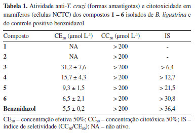 PARTE EXPERIMENTAL Procedimentos gerais Experimentos de extração assistida por micro-ondas (MAE) foram realizados em um forno de micro-ondas MAS-I (2450 MHz, Sineo Microwave Chemistry Technology Company, Xangai, China) com uma potência máxima fornecida de 1000 W sendo a temperatura interna monitorada por uma sonda infravermelha. Nas separações cromatográficas em coluna aberta foram utilizados gel de sílica (Merck, 230-400 mesh) e gel de Sephadex LH-20 (Amersham-Bioscience), enquanto nas análises com camada fina foi utilizado gel de sílica 60 PF254 (Merck) (0,25 mm) seguido de revelação com luz UV (254 e 366 nm). As separações por CLAE foram efetuadas em cromatógrafo Dionex Ultimate 3000, em coluna Luna Phenomenex C18 (5 µm, 250 mm × 10 mm, 120Å). Os espectros de massas de alta resolução foram registrados em espectrômetro Bruker Daltonics q-ToF Maxis, operando por ionização por electrospray, em modo negativo. Os espectros de ressonância magnética nuclear foram registrados em espectrômetro Varian Inova (1H: 500 MHz e 13C: 125 MHz). CDCl3 e DMSO-d6 foram utilizados como solventes e como referência interna o sinal residual do solvente. Material vegetal As partes aéreas de B. ligustrina DC. (Asteraceae) foram coletadas em Campos do Jordão/SP, Brasil em junho de 2017 recebendo o código de coleta SISGEN A4123E4. Uma exsicata foi preparada e comparada com aquela de número SPSF37589, catalogada no Herbário D. Bento Pickel, do Instituto Florestal de São Paulo (PMSP). Extração e isolamento dos constituintes químicos As partes aéreas de B. ligustrina, secadas e moídas (25 g), foram submetidas à extração assistida por micro-ondas (MAE) com 50 mL de mistura contendo H2O:BMImBr 1:1 (v/v) durante 15 min a 60 °C, sendo o líquido iônico brometo de 1-butil-3-metilimidazólio (BMImBr) preparado conforme descrito na literatura.26 Após esse procedimento, a solução foi filtrada e extraída sucessivamente com hexano (3 × 25 mL) e com AcOEt (3 × 25 mL). Após secagem com Na2SO4 e evaporação dos solventes sob pressão reduzida, foram obtidos 121 mg e 412 mg das fases em hexano e em AcOEt, respectivamente. Parte da fase em n-hexano (100 mg) foi submetida a fracionamento cromatográfico em gel de sílica utilizando-se misturas de n-hexano/AcOEt (9:1, 8:2, 7:3, 1:1, 6:4 e 3:7) fornecendo seis frações (H1 - H6). A fração H2 (12 mg) foi purificada via CLAE (C18, MeOH:H2O 3:7 com 0,1% de HCOOH), fornecendo 3 (5,1 mg), 4 (2,9 mg), 5 (0,7 mg) e 6 (0,5 mg). Parte da fase em AcOEt (150,0 mg) foi submetida à permeação em gel de Sephadex LH-20 eluída com MeOH fornecendo cinco frações (A1 - A5). A fração A2 (64,1 mg) mostrou-se composta por uma mistura de 1 + 2 enquanto a fração A3 (2,2 mg) mostrou-se constituída majoritariamente por 2. Parte de fração A2 (30,0 mg) foi purificada via CLAE (C18, MeOH:H2O 1:1 com 0,1% de HCOOH), fornecendo 1 (14,8 mg) e 2 (10,2 mg). Parasitas Formas tripomastigotas de Trypanosoma cruzi foram cultivadas em células LLC-MK2 (Rhesus Monkey Kidney Cells - ATCC CCL 7) em meio RPMI-1640, suplementado com 2% de soro fetal bovino (SFB) e mantidas a temperatura de 37 °C em estufa com 5% CO2.27,28 As formas amastigotas foram obtidas por meio da infecção de macrófagos aplicados a 1×105/poço com formas tripomastigotas na proporção de 5:1 parasitas/macrófagos e incubadas por quatro horas. Os parasitas foram contados em hemocitômetro e depois aplicados a 1×106/poço em placas de 96 poços. Células de mamíferos Fibroblastos de camundongo, NCTC clone 929 (American Type Culture Collection - ATCC CCL-1), foram fornecidas pela Seção de Culturas Celulares do Instituto Adolfo Lutz, São Paulo, e armazenadas em nitrogênio líquido a temperatura -70 °C. Posteriormente foram mantidas em meio M-199 suplementado com soro fetal bovino (SFB) 10%, sob a temperatura de 37 °C em estufa com 5% de CO2.29 Determinação do potencial frente as formas amastigotas de T. cruzi Para determinar a atividade contra amastigotas intracelulares, macrófagos peritoneais de camundongos BALB/c foram infectados com formas tripomastigotas de T. cruzi. Os macrófagos obtidos da cavidade peritoneal de camundongos BALB/c foram plaqueados em uma lâmina de câmara de 16 poços (NUNC, 1 × 105/poço) e incubados por 24 h a 37 °C em uma incubadora umidificada com 5% de CO2. Tripomastigotas foram lavados em meio RPMI-1640, contados e utilizados para infectar os macrófagos (parasita:macrófago, razão = 10:1). Após 2 h de incubação a 37 °C em uma incubadora umidificada com 5% de CO2, os parasitas não internalizados foram removidos por lavagem com meio. Os compostos a serem testados (1-6) foram incubados com macrófagos infectados (48 h a 37 °C, 5% CO2) em concentração seriada usando benznidazol como droga padrão. Ao final do ensaio, as lâminas foram fixadas com MeOH e coradas com Giemsa antes da contagem em microscópio de luz (EVOS M5000,THERMO). Os valores de EC50 foram calculados conforme descrito previamente.27,28 Determinação da toxicidade frente a células de mamíferos A citotoxicidade dos compostos 1-6 foi avaliada utilizando-se células NCTC (clone 929), na concentração de 6×104 células/poço. As células foram incubadas com os compostos isolados, em diluição seriada, em meio M-199 e 10% de soro fetal bovino em placas de 96 poços. Em seguida, as células foram mantidas em estufa a 37 °C com 5% de CO2 por 48 h. Após esse período, foram adicionados 20 µL de resazurina a 10%, seguido de incubação por 20 h, com a leitura realizada da mesma forma descrita acima.29 Análise estatística Os dados obtidos representam a média e o desvio padrão de amostras duplicadas de dois ensaios independentes. Os valores de CE50 foram calculados usando curvas sigmoide dose-resposta no software GraphPad Prism 5.0.