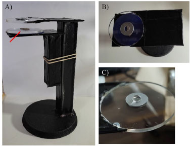 ![]() Figura 4. Estrutura do microscópio de gota de água com amostra posicionada na plataforma móvel. A) vista lateral, o local de posicionamento da amostra é mostrado com a seta; B) vista superior; C) gota de água posicionada na plataforma fixa do microscópio