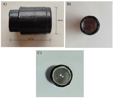 ![]() Figura 6. Microscópio alternativo construído pela combinação de lentes. (A) estrutura, (B) lente objetiva e (C) lente ocular