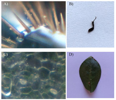 ![]() Figura 7. Capturas realizadas com o microscópio a partir da webcam (MW) utilizando A) ampliação de pata de besouro (FS); B) foto da pata de besouro original; C) folha de árvore ampliada; D) folha de árvore original