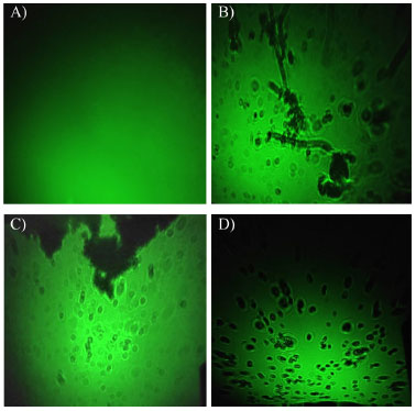 ![]() Figura 10. Projeção de amostras de água obtidas durante a aplicação do aparato denominado projetor de gotas utilizando (A) amostra de água filtrada, (B) amostra de água na qual as mãos foram lavadas, (C) amostra de água coletada da chuva e (D) amostra de saliva humana