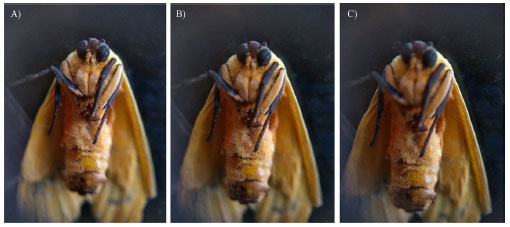 ![]() Figura 13. Capturas com posições focais diferentes, utilizadas posteriormente para realização da técnica de focus stacking. A) foco na porção superior; B) foco na porção intermediária e C) foco na porção inferior da imagem