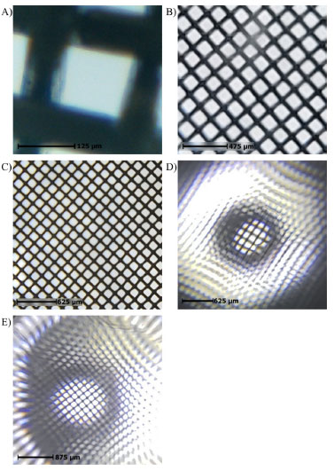 As escalas mostradas na Figura 15 foram estimadas por comparação com a abertura da peneira. Observa-se que o microscópio que apresenta a maior ampliação é o MW (Figura 15A), porém, a imagem apresenta baixa resolução devido à qualidade da câmera utilizada (640x480 pixels). Imagens melhores podem ser obtidas utilizando câmeras com melhor resolução, mas isso levaria ao aumento do custo de montagem do equipamento, que é o mais alto dentre os testados. Os demais microscópios (Figura 15B a 15E) apresentaram ampliações semelhantes, porém, as imagens registradas no MCL e no MS apresentam uma qualidade superior às do MGA e MGG. Os custos de produção desses microscópios são equiparáveis, sendo o custo do MS um pouco mais elevado devido à necessidade de aquisição de um apontador laser. Outro aspecto relevante é a facilidade de construção, sendo o MS e o projetor de gotas os dispositivos produzidos com maior facilidade. Os demais, como envolvem a manipulação de suportes ou da estrutura do miscroscópio, demandam um pouco mais de trabalho.