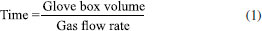 Finally, PVC gloves were passed through the glued drainage pipes, and clamped with steel worm clamps. A parafilm was placed over the safety valve as a security seal, which in case of an internal increase pressure the seal will break. Optionally, a power plug and light can be installed in the box in order to connect small pieces of equipment, such as scales. In this case, there should be care taken to seal the wire entrance point. Preparing and testing the inert atmosphere To test if the glove box maintains an inert internal atmosphere, a lighter was placed within the box and the acrylic lid closed and locked. Before creating the inert atmosphere in the glove box, it was first checked that the parafilm on the safety valve was intact and that the outlet valve was open and then N2 gas was injected into the glove box through the inlet valve for a time that was dependent on the gas flow-rate, which can be calculated using the Equation 1. As an option, a vacuum pump can be connected to the outlet valve to help remove the atmospheric gas initially present in the glove box.