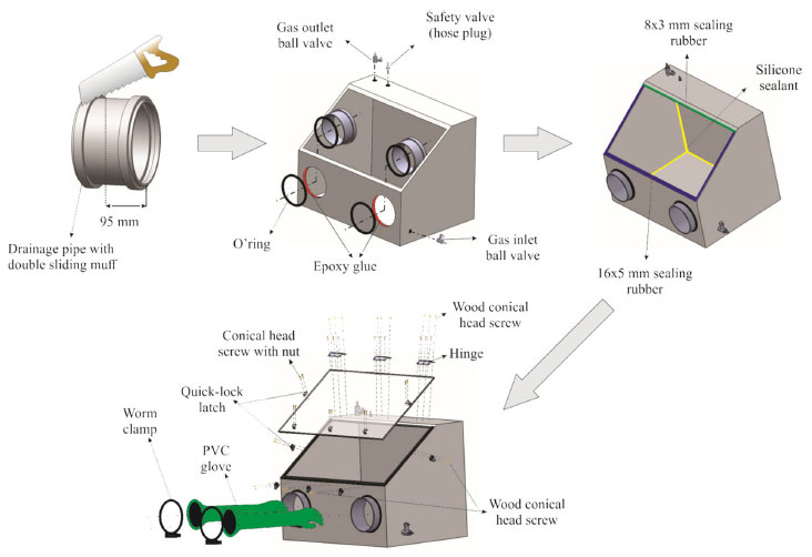 With the wooden box produced, all the components were mounted following the instructions given in Figure 2. First the drainage pipes with double sliding muff were cut at 95 mm width. Following this, using epoxy glue, these pieces were glued to the box using an inside/outside O-ring to reinforce the sealing. Holes (diameter 8 mm) were drilled in the right side and top side of the box to screw the inlet and outlet gas ball valves (screwed with hose plugs) and the safety valve (hose plug alone). Silicone sealant was applied at all internal junctions including valves nuts taking care not to clog them. To seal the acrylic lid, an 8x3 mm rubber strip was glued with shoe glue on the front top side of the box while 16x5 mm rubber was glued on the left, right and bottom side. After all glues and silicone sealant had dried, the acrylic lid was fixed on the box using three hinges. Five quick-lock latches were fixed using screws on the left, right and bottom side of the box to lock the acrylic lid so that a small pressure on the rubber is exerted when sealing the box.