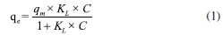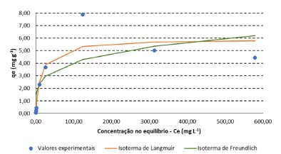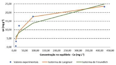 ![]() Figura 2. Isoterma de adsorção com valores experimentais obtidos nos ensaios conduzidos com o CA e soluções de Pb e isotermas de Langmuir e Freundlich (não linearizadas)
