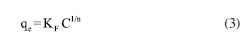 MATERIAIS E MÉTODOS Os resíduos orgânicos empregados na geração do composto foram principalmente restos de frutas, legumes e verduras (crus e sem tempero), cedidos por restaurantes parceiros do município de São Carlos (SP). Os resíduos foram triturados, homogeneizados e dispostos em leira. A composteira foi alimentada de forma intermitente com entradas semanais durante 1 mês, sendo que, ao final, a leira continha aproximadamente 250 kg de resíduos triturados. A composteira operou de novembro de 2017 até março de 2018, em condições externas estando, portanto, sujeita a influência do sol, vento e precipitações. Após maturados, o composto foi seco em temperatura ambiente e passado em peneira com abertura de 4# (4,76 mm), a fim de se retirar o excesso de matéria seca e resíduos grosseiros que não foram decompostos, como caroços. O material foi também quarteado, pelo método de pilhas alongadas, lavado com água deionizada, seco em temperatura de 60 a 65 ºC, destorroado e passado nas peneiras de 10# (2,00 mm) e 35# (0,50 mm) para seleção das partículas com dimensões entre 0,50 e 2,00 mm. A ativação consistiu no seguinte procedimento: aproximadamente 40,00 gramas de composto homogeneizado, lavado, seco e peneirado foram misturados com cerca de 220 mL de solução de H3PO4 1 mol L-1; o material e a solução ácida foram mantidos em contato por 12 horas sob temperatura controlada de 25 ºC; após o período de contato, a amostra foi filtrada e lavada com sucessivos enxágues de água deionizada até que o pH do filtrado permanecesse constante; em seguida, o material retido no filtro foi seco em estufa sob temperatura de 120 ºC por 1 h. A solução empregada na ativação foi preparada com ácido fosfórico P.A. (Orto), da marca Vetec, com concentração de 85% e densidade de 1,71 g mL-1. O material resultante do processo de ativação foi nomeado como composto ativado (CA). Ensaios de caracterização O CA foi caracterizado através da determinação dos seguintes parâmetros: potencial hidrogeniônico (pH);20 delta pH (ΔpH);21 ponto de carga zero (PCZ);21 potencial de óxido-redução (Eh);20 condutividade elétrica (CE);20 capacidade de troca catiônica (CTC);22 porcentagem de matéria orgânica e resíduo mineral;23 concentrações de potássio (K), fósforo (P), cálcio (Ca) e magnésio (Mg); composição elementar, em porcentagem, com relação a presença de carbono (C), hidrogênio (H), nitrogênio (N) e enxofre (S); e concentrações pseudo-totais de metais24 (incluindo Pb e Cd). Os grupos funcionais superficiais e a presença de minerais foram verificados, respectivamente, por meio dos ensaios de espectroscopia de infravermelho por transformada de Fourier (EITF) e difratometria de raios-X (DRX),25 antes e após o ensaio de equilíbrio em lote. Ensaios de equilíbrio em lote Os ensaios de equilíbrio em lote foram realizados para avaliar a capacidade de adsorção do CA em relação ao Pb e Cd. Esses metais foram escolhidos, pois estão associados a diversas contaminações no Brasil e no mundo. As soluções empregadas no ensaio foram preparadas a partir da diluição da respectiva solução-mãe, obtendo-se concentrações entre 20,11 e 889,20 mg L-1 de Pb e 1,56 e 667,50 mg L-1 de Cd. Para o preparo da solução-mãe de cada metal utilizou-se as seguintes soluções padrões: cloreto de cádmio (II) hemipentahidratado (pureza de 79,5-81%) e cloreto de chumbo (II) (pureza de 98%). O contato ocorreu entre 2,00 g de CA e 100 mL de solução com Pb ou Cd (na proporção de 1/50),13 sob constante agitação (120 rpm) e temperatura ambiente controlada em 25 ± 2 ºC. Após decorridos 24 h de agitação, as amostras foram centrifugadas por 10 min (2.500 rpm) e filtradas empregando-se papel filtro de gramatura 80 g m-2. Com o filtrado obtido, a determinação das concentrações de Pb e Cd foi realizada em espectrômetro de emissão ótica com plasma acoplado indutivamente (ICP-OES). Ao longo do processo de adsorção, o pH não foi ajustado e a variação deste parâmetro foi obtida pela medição do seu valor imediatamente após a mistura entre CA e a solução do respectivo metal (tempo 0) e depois de 24 h de contato. Os ensaios de equilíbrio em lote foram realizados em triplicata e cada conjunto de amostras foi acompanhado de brancos (contendo apenas a solução contaminante ou apenas o composto ativado e água deionizada). Isotermas de adsorção A partir dos resultados, buscou-se descrever o processo de adsorção por meio dos modelos matemáticos de Langmuir e Freundlich, avaliando-se o ajuste alcançado em relação aos dados experimentais e obtendo-se as respectivas isotermas de adsorção. O modelo de Langmuir assume que o adsorvente possui finitos e idênticos sítios, onde as moléculas e íons são adsorvidos e não exercem interferência nos adsorvatos vizinhos, bem como, não migram para outro sítio. A adsorção máxima ocorre quando todos os sítios foram ocupados formando uma monocamada de adsorvato.26,27 Nesse contexto, o adsorvato refere-se à molécula ou íon retidos e o adsorvente, ao material que interage com o adsorvato.27,28 A Equação 1 expressa matematicamente o modelo, onde qm é a capacidade máxima de adsorção por unidade de massa de adsorvente (mg g-1), KL é a constante de adsorção de Langmuir (L mg-1), relacionada com a entalpia do sistema, qe descreve a quantidade de adsorvato no equilíbrio por unidade de massa de adsorvente (mg g-1) e C, a concentração da substância presente na solução no equilíbrio (mg L-1).29 ![]() Para indicar a natureza do processo de adsorção, o fator de separação (RL) pode ser calculado a partir da concentração inicial de metal (C0) e pela constante de adsorção de Langmuir (KL), de acordo com a Equação 2.29 ![]() Sendo que, para RL igual a 1, a adsorção apresenta natureza linear e para RL igual a 0, trata-se de um processo irreversível. A adsorção é considerada favorável 