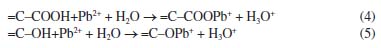 A isoterma de Langmuir apresentou melhor ajuste aos dados experimentais obtidos com o CA, tanto para o Pb quanto para o Cd. Conforme Tabela 2, verifica-se que os valores experimentais de qe aumentaram continuamente em função do acréscimo da concentração inicial de Pb. Deste modo, a isoterma de Langmuir da Figura 2 indica o início de um platô, com tendência de crescimento após concentrações de 889,20 mg L-1, de modo que o valor de qe pode alcançar o qm calculado de 26,17 mg g-1. Para o Cd, observa-se, na isoterma de Langmuir, a formação de uma região bem definida de menor inclinação - platô (Figura 3). Este fato em conjunto com o valor obtido para o qm de 5,93 mg g-1 sugere que o material está próximo da saturação para as concentrações iniciais acima de 281,95 mg L-1 de Cd. Na Figura 3, também é possível observar a existência de um resultado experimental que se apresentou destoante à isoterma de Langmuir. Para esta isoterma, decorrente deste valor, o coeficiente de determinação resultou em apenas 0,83, apesar de ter sido o modelo com melhor ajuste (Tabela 4). Considerando todas as concentrações iniciais estudadas, o fator de separação (RL) calculado pela Equação 2 variou, nos ensaios de adsorção de Pb, de 0,05 a 0,69, enquanto nos ensaios de adsorção de Cd, resultou entre 0,02 e 0,90. Como os valores se apresentam entre 0 e 1, o processo de adsorção, para ambos os metais, pode ser interpretado como favorável. Mecanismos de adsorção Nos ensaios conduzidos com soluções preparadas de Cd e Pb, foi verificada a diminuição do pH após 24 h de contato com o CA. Com isso, por meio da diferença entre o pH no tempo 0 e após 24 h, foi calculado a quantidade de íons H+ liberados ao longo do processo de adsorção (Tabela 5). Neste caso, a ocorrência de reações de complexação envolvendo Pb e Cd, como as descritas nas Equações 4 e 5, podem explicar a liberação de íons H+ e a diminuição do pH durante o ensaio de equilíbrio em lote.30-32,55 ![]()