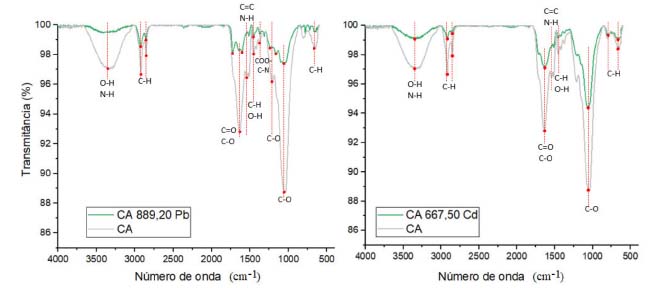 A partir dos resultados descritos na Tabela 1, verifica-se que o CA é constituído, principalmente, por C (46,55%), H (4,83%) e N (3,92%). O mesmo composto, não ativado, possui 36,62% de C, 6,70% de H e 4,51% de N em sua composição,12,13 indicando que a ativação com ácido fosfórico promoveu o aumento de C e a diminuição de N e H no material. Deste modo, a razão de C/N variou de 8,12 no CO para 11,88 no CA, e a razão H/C, diminuiu de 0,18 no CO para 0,10 no CA. A razão H/C representa a aromaticidade do adsorvente, sendo que, razões menores podem indicar maior aromaticidade e melhor estabilidade do material.12 O CA apresentou pH de 4,0 ± 0,1 e Eh de +230,4 ± 7,6 mV. Para o CO, empregando-se metodologias idênticas de determinação, o pH médio obtido foi de 8,6 ± 0,1 e o Eh foi de +31,4 ± 8,2 mV.12,13 Verifica-se que o processo de ativação foi responsável pela diminuição do pH em mais da metade do valor original, enquanto o Eh aumentou em cerca de 7 vezes no CA em comparação ao CO. Os valores positivos visualizados em ambos os materiais para o Eh não favorecem a mobilidade do Pb e Cd no ambiente. Por outro lado, as espécies ionizadas e mais móveis destes metais (Cd+2 e Pb+2) são predominantes em ambientes ácidos, dado a solubilidade destes metais em função do pH.33,34 Além disso, pelo princípio de Le Chatelier, em meios com concentração elevada de H+ (pH ácido), os grupos funcionais com hidrogênio presentes nas superfícies de materiais orgânicos encontram-se, preferencialmente, na sua forma deionizada, diminuindo a quantidade de sítios carregados negativamente, capazes de interagir com os cátions metálicos.35 Dessa forma, a adsorção de MPT, decorrida de forças eletrostáticas, pode ser menor no CA em comparação ao CO. Vale ressaltar que, este fato deve ser analisado em conjunto com o PCZ, parâmetro utilizado para análise das cargas superficiais existentes nos materiais, sendo que valores de pH acima do PCZ, indicam o predomínio de cargas superficiais negativas e, abaixo, de cargas positivas.36 Para o CA, o PCZ obtido foi de 2,4, indicando que, para valores de pH acima deste, o material apresenta predominantemente cargas superficiais negativas. Deste modo, mesmo para valores de pH caracterizados como ácidos, a retenção dos cátions de Pb e Cd pode ser favorável, desde que o pH esteja acima de 2,4. O valor de PCZ verificado nos estudos conduzidos com o CO foi de 7,1012,13 sugerindo que a capacidade de adsorção do material será maior em soluções alcalinas, com contribuição tanto da precipitação do Pb e Cd quanto das interações ocorridas entre estes metais e os grupos funcionais carregados negativamente. Em concordância, a partir dos valores negativos observados para o parâmetro de ΔpH, conclui-se que tanto o CO (em pH igual a 8,6) quanto o CA (em pH igual a 4,0) possuem, predominantemente, cargas superficiais negativas.13 Para caracterização dos grupos funcionais existentes nos materiais, apresenta-se os resultados de EITF na Figura 1.