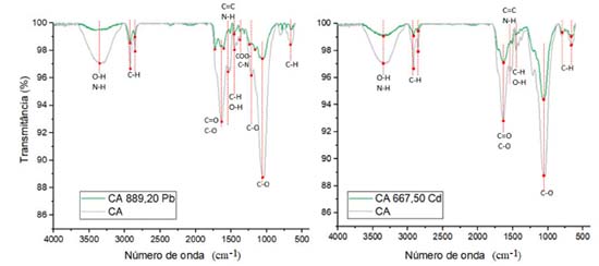 Além disso, diante das concentrações de Ca e Mg verificadas após o equilíbrio (contato de 24 h com o composto ativado), pode-se observar que, possivelmente, a troca catiônica apresenta grande importância na adsorção do Pb e Cd, visto que houve um aumento considerável da quantidade dos cátions em solução em função do aumento da concentração inicial destes metais. As concentrações de Na e K também foram determinadas, porém mantiveram-se aproximadamente similares entre as amostras dos ensaios de equilíbrio em lote (Tabela 5). Vale ressaltar que as concentrações de K, Na, Ca e Mg também foram analisadas por ICP-OES nas soluções preparadas de Pb e Cd (sem mistura com o composto ativado), sendo que os resultados variaram de 0,00 a 0,08 mmolc L-1 para o Ca, de 0,01 a 0,05 mmolc L-1 para o K, 0,00 a 0,002 mmolc L-1 para o Mg e 0,03 a 0,07 mmolc L-1 para o Na. Diante de tais resultados, conclui-se que concentrações elevadas destes cátions nas amostras após contato por 24 h com o CA foi proveniente exclusivamente do próprio adsorvente e das interações entre os materiais e as soluções de Pb e Cd. A análise de EITF no CA antes e após ensaio de equilíbrio em lote (com solução de concentração inicial de Pb de 889,20 mg L-1) demonstrou que houve redução na intensidade da maioria dos picos e/ou uma ligeira alteração no número de onda verificado, demonstrando que houve interações entre os metais e os grupos funcionais superficiais (Figura 4).40,51 Ressalta-se, após a adsorção do Pb, houve uma expressiva diminuição ou até o desaparecimento dos seguintes picos: 3350 cm-1 (O-H/N-H);11,39,40 1633/1605 cm-1 (C=O/C-O);11,44,45 e 1056/1060 cm-1 (C-O).50,51 Outros picos que também apresentaram alterações, foram: 2920/2924 e 2851/2855 cm-1 (C-H);38,41-43 1454/1458 cm-1 (C-O/C-H)42,45 e 1214/1240 cm-1 (C-O).40,45,48,49
