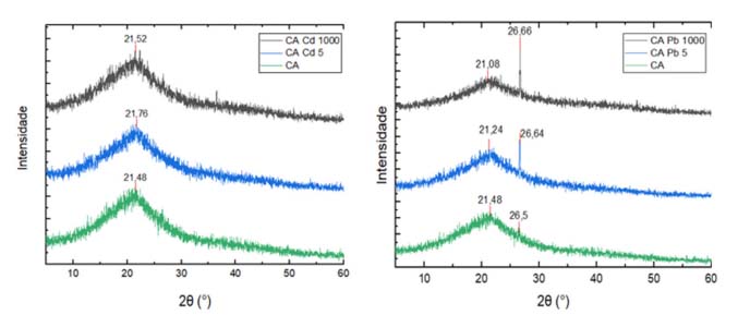 Da mesma forma, observa-se a diminuição dos picos após ensaio de adsorção com o CA e solução contendo Cd na concentração de 667,50 mg L-1 (Figura 4). Neste caso, as bandas que se destacaram pela mudança foram: 3350 cm-1 (O-H/N-H);11,39,40 2919 e 2851 cm-1 (C-H);38,41-43 1633/1605 cm-1 (C=O/C-O);11,44,45 e 1056/1060 cm-1 (C-O).50,51 Deste modo, evidencia-se a relevância dos grupos funcionais contendo O na adsorção de Pb e Cd no CA. As mudanças nos picos anteriormente mencionados, para os dois metais analisados, indicam que os grupos ácidos, carboxila e hidroxila, são contribuintes predominantes na captação destes íons metálicos. Além do EITF, foram realizados ensaios de DRX (Figura 5). Comparando os resultados antes e após adsorção, não foi observado o surgimento de novos picos, indicando que, para o CA, a precipitação não foi um mecanismo de adsorção relevante, o que pode estar relacionado ao pH ácido das amostras.