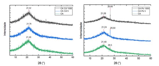 ![]() Figura 5. Difratogramas resultantes do ensaio de DRX com CA antes e após ensaio de equilíbrio em lote com soluções de Cd e Pb