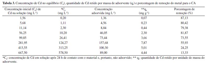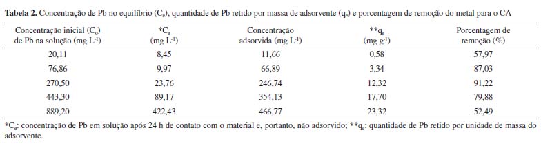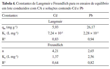 A capacidade de adsorção do CA foi maior nas concentrações iniciais de Pb entre 76,86 e 443,30 mg L-1. Para estes casos, as porcentagens de remoção resultaram iguais ou acima de aproximadamente 80,00%. Para as concentrações iniciais de Pb de 20,11 e 889,20 mg L-1, as porcentagens de remoção foram de, respectivamente, 57,97 e 52,49% (Tabela 2). Nos ensaios conduzidos com soluções de Cd, de modo geral, a capacidade de adsorção do CA diminuiu com o aumento da concentração inicial do metal, alcançando apenas 13,33% de porcentagem de remoção na maior concentração inicial estudada (667,50 mg L-1) (Tabela 3). No geral, para o composto ativado, as porcentagens de remoção variaram de 52,49 a 91,22% para o Pb, considerando as concentrações iniciais de 20,11 a 889,20 mg L-1. O mesmo material, em contato com solução com Cd em concentrações iniciais de 1,56 a 667,50 mg L-1, apresentou porcentagens de remoção de 13,33 a 87,13%. Em estudo realizado com o CO, observou-se porcentagens de remoção entre 45 e 100% para as concentrações iniciais de Cd de aproximadamente 1, 5, 10, 50, 100, 300, 500 e 1.000 mg L-1, sendo que, para as concentrações menores ou iguais a 300 mg L-1, a retenção foi de 100,00% em todas as amostras. Da mesma forma que no CA, as porcentagens de remoção diminuíram em função do aumento da concentração inicial de Cd. Considerando as concentrações iniciais de Pb de 50, 100, 300, 500 e 1.000 mg L-1 as porcentagens de remoção no CO resultaram em 58,9%, 46,6%, 68,3%, 77,4% e 87,5%, respectivamente. Enquanto no CA, a maior porcentagem de remoção (de 91,22%) ocorreu para a concentração de 270,50 mg L-1, no CO, a máxima retenção (87,5%) foi verificada na maior concentração inicial de Pb (1.000 mg L-1). Isotermas de adsorção As isotermas de adsorção descrevem graficamente a relação dinâmica de equilíbrio entre a quantidade do MPT que permanece em solução (Ce) e a quantidade adsorvida por unidade de massa do adsorvente (qe). A Tabela 4 apresenta as constantes de Langmuir e de Freundlich e os respectivos coeficientes de determinação obtidos para os ensaios de equilíbrio em lote conduzidos com CA e soluções contendo Cd e Pb. Além disso, as Figuras 2 e 3 exibem as isotermas de adsorção para o Pb e para o Cd, respectivamente.