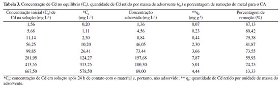 Observa-se que as bandas identificadas são similares em ambos os materiais, exceto pelos picos em 1412 cm-1 e em 873 cm-1, identificados exclusivamente no CO e correspondentes às estruturas alifáticas, ácidos carboxílicos ou grupos fenóis (C-H/O-H)37 e ao estiramento da ligação C-O ou à deformação da ligação aromática entre C-H (C-O/C-H),11,38 respectivamente. O desaparecimento destes picos no CA, sugere que a ativação ocasionou a degradação de parte da estrutura do CO, com perda de grupos funcionais. Outros picos identificados em ambos os materiais foram: 3350/3281 cm-1, atribuídos ao estiramento da ligação O-H (grupos hidroxilas, álcoois e fenóis) com possível contribuição de ligações N-H (grupos amina e amida) (O-H/N-H);11,39,40 2920 e 2851 cm-1, relacionados ao estiramento de ligações entre C e H de grupos alquila, como metileno, metil e metóxi (C-H);38,41-43 1633/1636 cm-1, correspondentes ao estiramento de ligações C=O de grupos carboxílicos, amida, cetonas, aldeídos e ésteres ou ao estiramento da ligação C-O de grupos carboxílicos ionizados (C=O/C-O);11,44,45 1542/1540 cm-1, decorridos da deformação da ligação N-H (grupos amina e amida) ou C=C aromático (C=C/N-H);40,46,47 1214/1229 cm-1, relacionados ao estiramento de C-O em éteres, álcoois e fenóis e deformação de OH em grupos carboxílicos (C-O);40,45,48,49 e 1056/1056 cm-1, atribuídos à ligação C-O de fenóis, álcoois, ésteres e éter (C-O), ou ainda, a grupos funcionais contendo P (PO2, P-OH).39,41,50,51 A presença de grupos funcionais contendo O pode ser considerado um importante fator para o bom desempenho dos adsorventes em relação aos MPT.52 Além da possível degradação da estrutura química do CO indicada pelo desaparecimento de grupos funcionais, observou-se que a ativação com ácido fosfórico e a realização de sucessivos enxágues causou a liberação de parte dos sais e dos elementos de maior mobilidade, de modo que a CE diminuiu de 4.253,0 µS cm-1 no CO para 208,5 µS cm-1 no CA e o resíduo mineral reduziu de 22,17 ± 0,07% no material original para 17,47 ± 3,56%, no ativado, sendo que, neste último material, os minerais insolúveis predominaram, enquanto que no CO, a maior parte do resíduo mineral encontrava-se em sua forma solúvel. Ainda nesse sentido, as concentrações de P, K, Ca e Mg foram reduzidas no material ativado em, respectivamente: 69%, 99%, 90% e 91%. Porém, essa modificação não impactou significativamente na CTC do CA. A CTC indica diretamente a quantidade de cátions trocáveis presentes na superfície de determinado material, ou seja, fornece informações sobre a quantidade de cátions em condições de serem permutados por outros.35 No caso do composto, o valor da CTC foi ligeiramente maior no CO em relação ao CA: 92,0 ± 9,9 cmolc kg-1 para o material original e 75,0 ± 0,7 cmolc kg-1. A degradação da estrutura química e a liberação dos sais e de elementos móveis, pode ser negativa ao reduzir o número de grupos funcionais disponíveis para complexação com os MPT, porém, pode também ser positiva caso esse processo resulte no aumento da porosidade e na área superficial do material. Por fim, ressalta-se que os valores verificados para Pb e Cd foram, respectivamente, 0,30 ± 0,12 mg kg-1 e 2,24 ± 0,75 mg kg-1 no CA. Estes valores são consideravelmente inferiores aos limites máximos admitidos em fertilizantes orgânicos segundo a Instrução Normativa nº 27/2016 (Pb: 150 mg kg-1 e Cd: 3,00 mg kg-1),53 assim como, aos valores de referência de qualidade do solo (VRQ) previstos na Decisão de Diretoria nº 195-2005-E da CETESB (Pb: 17 mg kg-1 e Cd: 0,5 mg kg-1).54 Adsorção de Pb e Cd O desempenho do CA na retenção de Pb e Cd foi avaliado por meio dos ensaios de equilíbrio em lote (Tabelas 2 e 3). A concentração inicial (C0) foi obtida por meio da análise em ICP-OES das amostras em branco, constituídas apenas pelas soluções de Pb e Cd.