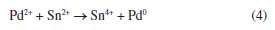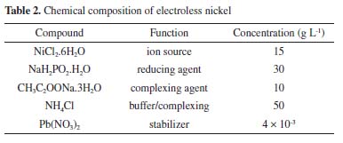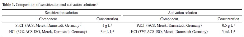 EXPERIMENTAL Materials All chemicals were reagent grade and used without further purification. Ninety-nine point six percent (99.6%) polished Al2O3 ceramic (CoorsTek, Golden, USA), with dimensions 25.4 × 25.4 × 0.6 cm was used as substrate. This material was chosen due to its excellent mechanical properties, low roughness (< 1 µm), excellent corrosion resistance, high thermal conductivity at 100 ºC (26.6 W mk-1), high dielectric constant (9.9 at 1 MHz) and uniform density (3.87 g cc-1).25 Pre-treatment Samples were pre-treated with sulfuric acid (95-97% P.A., Merck, Darmstadt, Germany) and nitric acid (62-70% ACS, J.T. Baker, New Jersey, USA). The ratio of the acid solution was H2SO4:HNO3 19:1 (v:v). The samples remained in the solution during 10 min at 90 ºC under stirring agitation, followed by rinsed in circulation de-ionized (DI) water (with resistivity 18 MW cm) during 3 min and sonicated for 5 min. This pre-treatment not only eliminates organic compounds adsorbed on the Al2O3 surface, but it also removes micro waste, which possibly comes through the mechanical polishing process during the fabrication of the substrates. The nano sized Al2O3 particles on the surface improve the mechanical bonding of the metallic seeds, it also improves the wetting of the seeding solution10 and is crucial for improvement of the pull strength.26 Recently, Zhang et al.27 have also reported the deposition of Ni-P on alumina substrates. However, they used a different Ni-P solution for the deposition and their procedure involved more steps in the substrate activation. Nucleation Surface nucleation methods, sensitization and activation are reported in the literature.10,22,28-32 These methods are all based on solutions containing tin (Sn) and palladium (Pd) ions. The process of nucleation occurs only in the polished side. The other side (unpolished) of the pretreated alumina was wrapped with insulating tape (3M, Sumaré, Brazil) to prevent the nucleation. The Al2O3 substrate was seeded with Pd by being dipped successively in acid tin chloride solution (SnCl2) followed by acid palladium chloride solution (PdCl2) at 25 ºC (Equation 4). Each dip lasted about 15 to 30 s and was followed by washing, using slowly immersion in distilled water for about 10 s between each dip. Because the sensitizing solution deteriorate quickly after preparation, the process was carried out within 2 hours of solution preparation.33 The composition of the sensitization and activation solutions are given in Table 1.