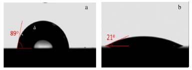 ![]() Figure 3. Contact angle images of the alumina surfaces (a) before and (b) after the wet treatment