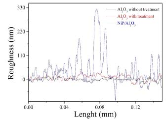 The graphs obtained using the equipment profilometer DEKTAK showing the roughness of Al2O3 before and after wet treatment, and the behavior of Ni-P film morphology deposited by electroless process at 40 ºC on the treated Al2O3 are shown on Figure 6.