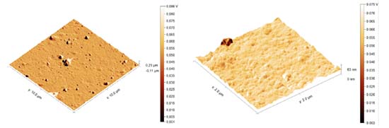 At the present moment, there is no test that can precisely assess the actual physical strength of an adhesive bond. However, it can also be said that the thin film of Ni-P after wet treatment of alumina obtained a relative adhesion performance. Surface morphology The surface morphology of Ni-P at 40 ºC deposits employed by SEM (Figure 2S, supplementary material) showed homogeneous coating over the Al2O3 surface area, with particles size smaller than 1 µm of Ni-P deposited on a smooth surface, forming a thin nanostructured film. It can be seen in Figure 2S that the growth of the thin film is quite compact, without cracks and holes. It is observed in Figure 2S(b) that the metallic thin film is formed presenting a spherical shape and the average size of these spheres is smaller than 1 µm. Figure 8 shows images obtained by AFM of Ni-P thin film plating on Al2O3; the results are similar of what was found from SEM and perfilometer analyzes.