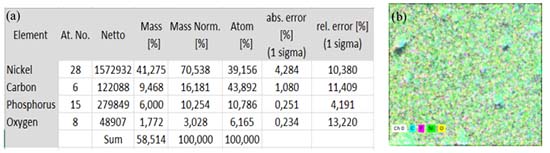 ![]() Figure 9. EDS quantification (a) and element distribution (b) of electroless Ni-P deposition over Al2O3 substrate