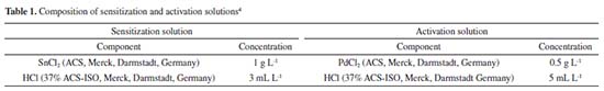 ![]() After nucleation, the substrate showed a light brown color and the tape was removed. Then, the Al2O3 substrates were dipped in an accelerating solution prepared by a 1% chloride acid (HCl) solution that removes the excess ionic tin.15 Electroless deposition After nucleation, a non-commercial solution of electroless Ni-P similar to that reported by Campos et al.24,34 was used. The chemical bath composition is given in Table 2.