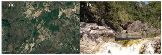 ![]() Figura 2. (a) Localização da captação e ETA de Cavalcante (fonte: imagem Google Earth, maio/2022); (b) poço de captação de água bruta de Cavalcante no Rio das Pedras
