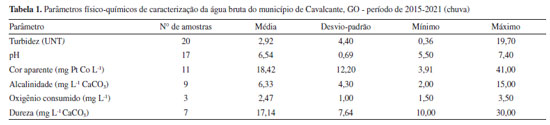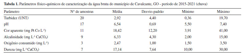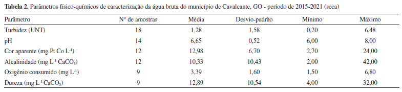 RESULTADOS E DISCUSSÃO Caracterização da água bruta Diversos fatores intervêm no desempenho das estações de tratamento de água, destacando-se as características da água bruta, parâmetros hidráulicos relacionados aos processos, a acurácia da operação e as metas de qualidade da água tratada. Sabe-se que falhas no tratamento podem comprometer a qualidade da água tratada e expor a comunidade a diversos riscos relacionados à saúde. Dentre estes fatores, as características da água bruta ocupam posição de relevância na qualidade da água tratada.14 Nas Tabelas 1 e 2 podem ser visualizadas as características da água bruta do município de Cavalcante, GO em épocas de chuva e seca.