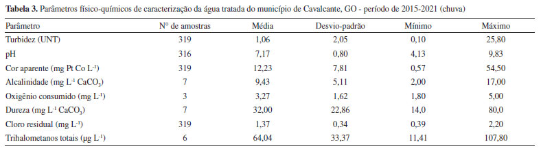 PARTE EXPERIMENTAL Sistema de tratamento da água de Cavalcante, GO O sistema de abastecimento público estudado pertence ao município de Cavalcante, localizado ao norte do estado de Goiás, às margens da GO-241, inserido na mesorregião Norte Goiano e na microrregião Chapada dos Veadeiros. A população atendida pelo sistema é de 5.028 habitantes, com uma vazão média de 46 m3 h-1, segundo dados fornecidos pela operadora do sistema, Companhia de Saneamento do estado de Goiás (SANEAGO). O clima no município é tropical, com temperatura média de 23,1 °C. O período chuvoso compreende os meses de dezembro a março e os meses mais secos estão entre abril e setembro, com pluviosidade média anual de 1895 mm.9 A estação de tratamento de água (ETA) foi projetada e construída no início da década de 1990, utilizando a tecnologia de dupla filtração para tratamento, alimentada por captação superficial no Rio das Pedras. Localizado no Parque Estadual da Chapada dos Veadeiros, uma das áreas mais importantes de conservação do Planalto Central do Brasil, o manancial de abastecimento sofre pouca influência de ações antrópicas, e possui mata ciliar preservada. O tratamento consiste na aplicação do coagulante sulfato de alumínio (Al2(SO4)3), na tubulação de chegada de água bruta na área da ETA, e a mistura rápida é promovida no interior da tubulação de adução ao sistema de filtração. Após a coagulação, a água é conduzida à filtração ascendente e em seguida à filtração descendente, posteriormente, o processo de desinfecção é realizado no tanque de contato com adição de cloro gasoso (Cl2); para fluoretação é aplicado o ácido fluossilícico; e para correção do pH é adicionada cal hidratada (Ca(OH)2). Análises realizadas O monitoramento da água bruta e tratada é de responsabilidade da Companhia de Saneamento do Estado de Goiás (SANEAGO), operadora do sistema. A frequência e os parâmetros a serem monitorados são estabelecidos por meio da Portaria de Potabilidade No. 888, publicada em 4 de maio de 2021, elaborada pelo Ministério da Saúde, que dispõe sobre os procedimentos de controle e vigilância da qualidade da água para consumo humano e padrões de potabilidade.10 Os valores de parâmetros da qualidade da água foram estudados entre os anos de 2015 a 2021 para água bruta e tratada. Para representar o período de seca foram analisados os dados dos meses de: abril, maio, junho, julho, agosto e setembro. Para o período de chuva foram analisados os dados dos meses de: outubro, novembro, dezembro, janeiro, fevereiro e março. As coletas de água bruta foram realizadas na chegada da ETA onde existe uma torneira específica para coleta de água bruta. As amostras de água tratada foram coletadas na ETA, na saída do tanque de contato, onde são adicionados o cloro e o flúor. Os parâmetros ambientais escolhidos para avaliação do estudo representam as variáveis envolvidas direta e/ou indiretamente na formação de THMs, tais como: cor aparente, turbidez, pH, cloro residual livre, oxigênio consumido, dureza, alcalinidade total e trihalometanos totais; compreendendo um total de 49 amostras de água bruta e 660 amostras de água tratada. As análises foram realizadas no Laboratório Regional de Águas de Campos Belos e Laboratório Central de Águas da SANEAGO e disponibilizadas/autorizadas para estudo conforme ofício 5711/2022. Todas as análises foram realizadas conforme Standard Methods for the Examination of Water and Wastewater, 23rd edition.11 O estudo e manipulação dos dados foram realizados no Laboratório de Tratamento de Águas Residuárias - Labtar, localizado no Instituto de Química da Universidade Federal de Goiás (UFG). Estudo estatístico No tratamento estatístico dos dados foram calculados os principais parâmetros da estatística descritiva: médias aritméticas, máximo, mínimo, desvio padrão; bem como, a aplicação de correlações lineares. Os dados foram agrupados por ponto de amostragem, período chuvoso e período de seca. Para evidenciar correlações significativas entre as variáveis físico-químicas e a formação de THMs foi aplicado o teste de correlação de Pearson. As correlações foram definidas como fracas (0,00 < R < 0,39), moderadas (0,40 < R < 0,69) e fortes (0,70 < R < 1,00).2,12,13