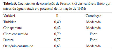 Os trihalometanos formados em maior proporção são: clorofórmio (CHCl3), bromodiclorometano (CHBrCl2), dibromoclorometano (CHBr2Cl) e o bromofórmio (CHBr3) e são chamados de trihalometanos totais. Segundo Shariati-Rad e Fattahi25 o nível máximo do contaminante clorofórmio (CHCl3) é de 300 µg L-1 em amostra de água para consumo humano. Para bromodiclorometano (CHBrCl2) o máximo permitido em água para consumo seria de 60 µg L-1.26 Para dibromoclorometano (CHBr2Cl) e o bromofórmio (CHBr3) os padrões internacionais permitem um máximo de 100 µg L-1 de cada composto, conforme citado por Salari et al.27 Considerando que a legislação brasileira de potabilidade estabelece como valor limítrofe a concentração de 100 µg L-1 (THMs), apenas uma amostra (7%) apresentou valor superior ao limite máximo estabelecido. Diferenças entre o período chuvoso e seco foram evidenciadas, e aumento percentual de 34% da concentração média de THMs durante as chuvas, caracterizando o período com o maior potencial de formação de trihalometanos. Segundo Lee et al.,28 além de períodos de chuva a matéria orgânica de origem natural (MON) é potencialmente mais lixiviada e, portanto, mais disponível para reação com cloro residual livre e consequentemente formação de THMs. Correlação entre as variáveis físico-químicas da água tratada e a formação de THMs Considerando que a turbidez, cor aparente e oxigênio consumido são indicadores da presença de substâncias orgânicas, oriundas da degradação da matéria orgânica vegetal (substâncias húmicas) e/ou antropogênica e sabendo que estas substâncias em contato com o cloro podem dar origem aos THMs, a correlação moderada, encontrada neste estudo, reforça a importância do monitoramento de tais parâmetros para o controle na formação de subprodutos da desinfecção (Tabela 5).