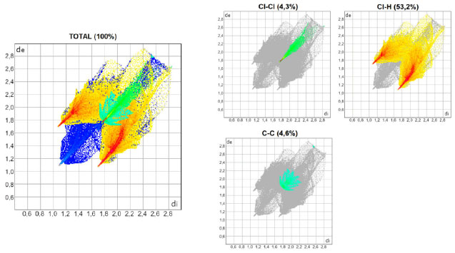 O software CrystalExplorer 21.5®14 foi empregado para o cálculo das superfícies de Hirshfeld (função dnorm e shape index) e dos gráficos bidimensionais de impressão digital. As superfícies de Hirshfeld foram mapeadas entre o azul (maiores distâncias) e o vermelho (menores distâncias). Os gráficos bidimensionais foram mapeados entre 0,4 e 3,0 Å para cada par de distâncias de e di. As cores dos gráficos bidimensionais foram modificadas com o auxílio do software GIMP 2.10.24®22 para uma melhor distinção das diferentes interações não-covalentes. O software VESTA®23 foi usado para a medida das distâncias das ligações não-covalentes a partir das informações cristalogáficas dos arquivos CIF e os valores foram comparados com a soma dos raios de van der Waals para os halogênios.24