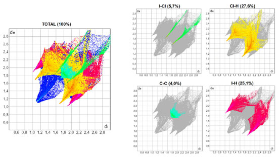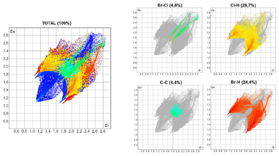 As Figuras 3, 4 e 5 mostram os gráficos de impressão digital para os complexos 1, 2 e 3, respectivamente, onde as LX são representadas na cor verde e aparecem como uma "linha" quando X = Y ou como "asas" quando X ≠ Y. 27 Isso ocorre devido à natureza pseudo-espelhada destes gráficos,28 ou seja, quando X = Y temos apenas contatos do tipo Cl···Cl na superfície (complexo 1) e quando X ≠ Y os contatos são do tipo X···Y/Y···X (complexos 2 e 3). Os contatos mais próximos observados nos gráficos, com valores de de + di próximos de 3,6 Å (complexo 1), 3,5 Å (complexo 2) e 3,4 Å (complexo 3) acompanham o aumento da polarizabilidade de X e consequente aumento das áreas em vermelho nas superfícies de Hirshfeld e estão de acordo com os dados cristalográficos listados na Tabela 1S. A porcentagem de contribuição das interações X···Y nas superfícies de Hirshfeld aumenta com o aumento da polarizabilidade de X, sendo os valores encontrados de 4,3, 4,6 e 5,7% para os complexos 1, 2 e 3, respectivamente, como indicado nos gráficos decompostos nas Figuras 3-5. Na Tabela 2S estão listadas todas as contribuições relativas das interações não-covalentes para a superfície de Hirshfeld para todos os complexos orto-substituídos.