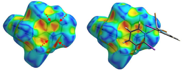 ![]() Figura 6. Superfície de Hirshfeld na função shape index para o complexo 8. Esquerda: as setas vermelhas indicam os triângulos adjacentes característicos da presença da interação π···π. Direita: duas moléculas adjacentes, dentro e fora da superfície, demostram o empilhamento dos anéis aromáticos em um arranjo do tipo face a face com deslocamento