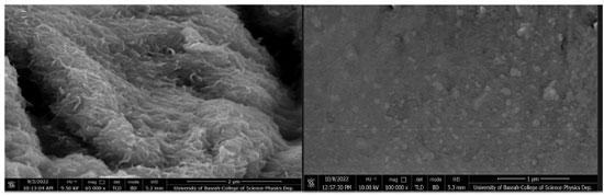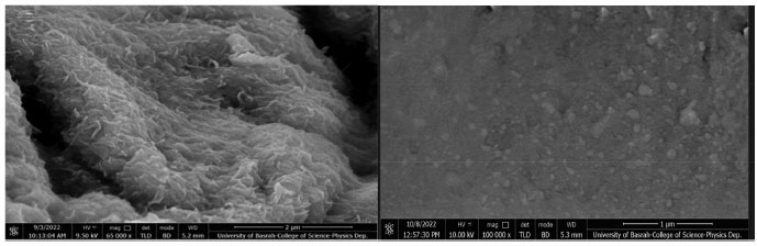 ![]() Figure 4. SEM image of (left) partially cross-linked chitosan with glutaraldehyde and (right) HU embedded in the chitosan matrix