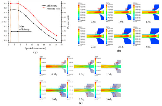 RESULTS AND DISCUSSION Analysis of the influencing factors of the pump efficiency Effect of spout distance on the pump efficiency of jet pump As shown in Figure 3a, the maximum pump efficiency is obtained when the spout distance is between 2.61 and 5.22 mm. As spout distance increases, the pump efficiency decreases gradually, and the decreased amplitude is evident. When the spout distance is 13.05 mm (2.5), the pump efficiency is only about 21%. The results prove that spout distance is one of the main factors affecting pump efficiency. With the gradual increase of spout distance, the pressure ratio curve has the same trend as the pump efficiency (first increases and then decreases).