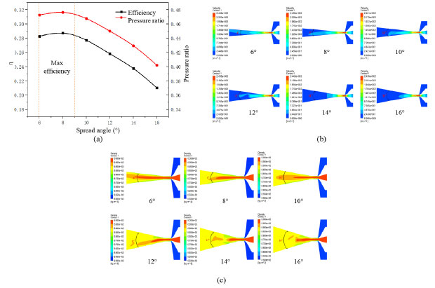 Figure 5b plots the velocity cloud within the duct at different duct distances in the jet pump. With increasing duct distance (aspect ratio), the maximum velocity within the duct always fluctuates between 243 and 246 m s−1, and the region size of the highest velocity is almost the same. Although the duct outlet velocity fluctuates between 194 and 197 m s−1, the region of the export velocity increases with duct distance. This is because the dynamic fluid and the inhalation fluid have been fully mixed in the duct, and the diameter does not change. Even if the duct distance increases again, the flow rate of the mixture does not change much, but the flow rate region will increase with the increase of duct distance. Figure 5c shows a diagram of the velocity cloud at the duct outlet at different duct distances in the jet pump. When the duct distance is 33.25 mm, the maximum velocity at the outlet is about 134 m s−1, and this velocity region is small. However, as the duct distance gradually increases, the maximum velocity at the duct outlet also gradually decreases, and when the aspect ratio gradually increases, the highest velocity area gradually increases. This is due to the increase of the aspect ratio; the contact time between the dynamic fluid and the suction liquid in the product becomes longer so that the dynamic fluid and the suction liquid have full energy transfer, and the maximum velocity area gradually increases with the increase of the aspect ratio. Effect of spread angle on the pump efficiency of jet pump As shown in Figure 6a, when the spread angle is between 6 and 8°, the pump efficiency gradually increases with increasing spread angle. However, when the spread angle is greater than 8°, the pump efficiency decreases gradually with the increase of the spread angle. Thus, it can be determined that the spread angle interval for maximal pump efficacy is between 6 and 9°. Moreover, with the spread angle increase, the pressure ratio curve shows the same trend as the pump efficiency.