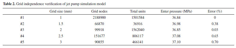 By comparing and analyzing the simulation results of different grid sizes, it is found that when the grid size in the model is 1-2 mm, the pressure value at the dynamic fluid inlet (Inlet1) is almost the same (the error is within 1%). The simulation results well verify the grid independence of the model. To reduce the operation time of the finite element simulation, the #3 grid division method with a grid size of 2 mm is selected for the simulation model of the jet pump. Accurate validation of the simulation results To verify the accuracy of the simulation results, the simulation pressure value of the dynamic fluid inlet (Inlet1) and the suction fluid inlet (Inlet2, Inlet3) are extracted to compare with the test data. As can be seen from Table 3, the difference between the simulation and the theoretical pressure (calculated from the basic characteristic equation of the jet pump)18 value at the dynamic fluid inlet is 2.82 MPa, and the relative error between the two is 8.3%. Moreover, the simulation pressure value at the inlet of the suction liquid is also very close to the theoretical pressure value, and the average relative error between the two is only 7.8%. Therefore, the simulation model has some accuracy within the allowable error limits.