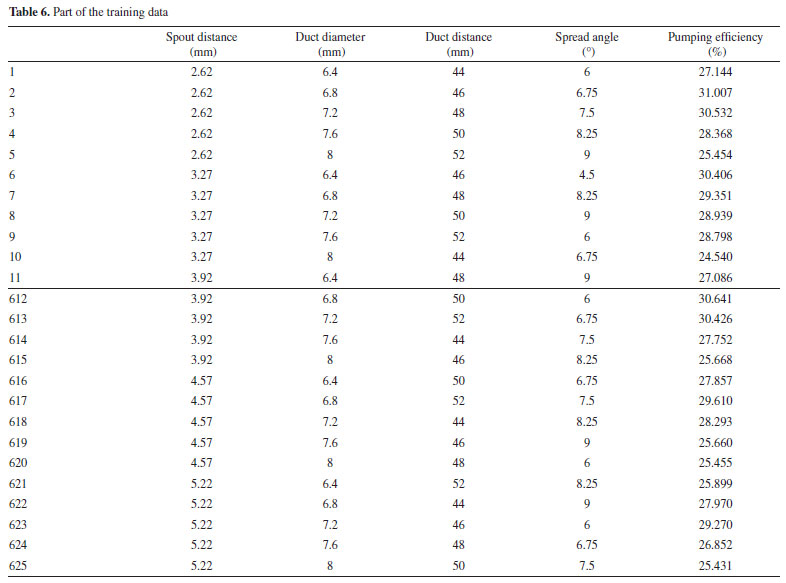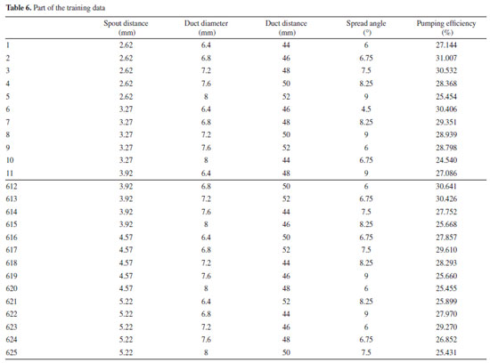 According to the parameter combination and level division of Tables 5 and 6, the 625 (5 × 5 × 5 × 5) groups' training data are obtained. The simulation calculates the pump efficiency of the jet pump according to different parameter combinations. The part of simulation results is shown in Table 6.